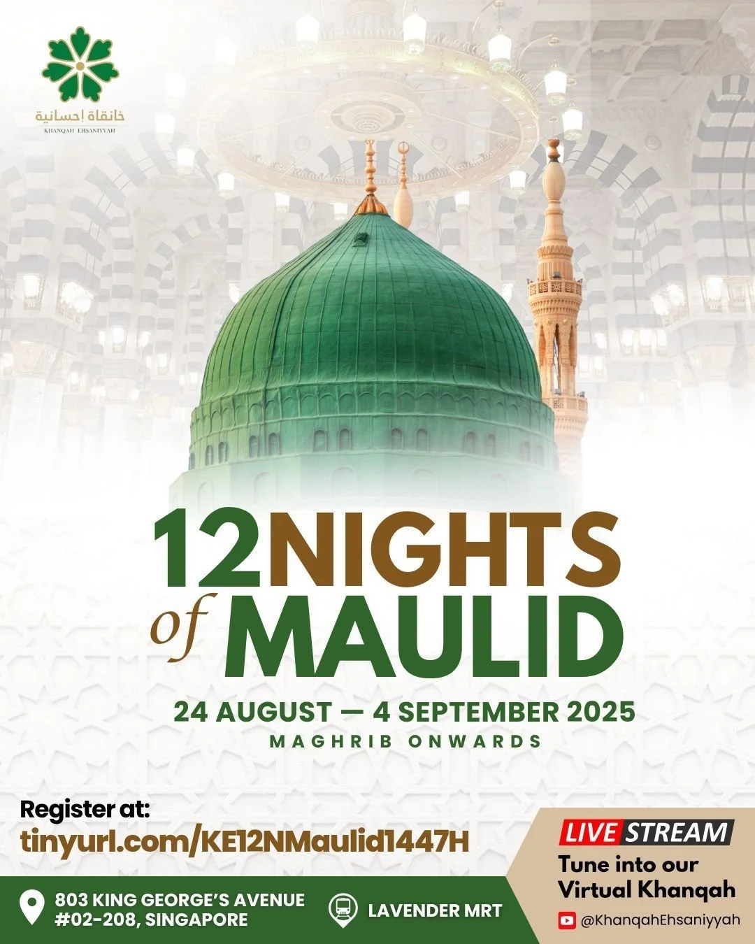Annually at Khanqah Ehsaniyyah, we celebrate 12 nights of Maulid on the first 12 nights of Rabiulawal in order to spark and rekindle the love for our Prophet ﷺ. We would like to warmly welcome everyone and anyone from all walks of life to join us in this joyous occasion in celebrating the birth of our Prophet ﷺ.